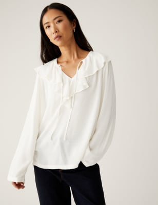 White ruffle neck on sale blouse long sleeve